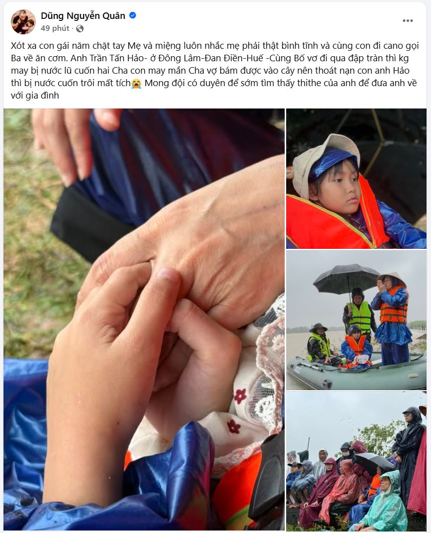 Giữa dòng nước đục ngầu cuộn xiết ở Đông Lâm – Đan Điền (Huế), hình ảnh được anh Nguyễn Quân Dũng chia sẻ khiến ai nấy không khỏi xót xa: Một cô bé nhỏ xíu trong chiếc áo phao cam, đôi mắt ngây thơ mà buồn đến nao lòng. Cô bé nắm chặt tay mẹ, giọng run run: “Mẹ ơi, bình tĩnh nha, mình đi cano tìm Ba về ăn cơm…”