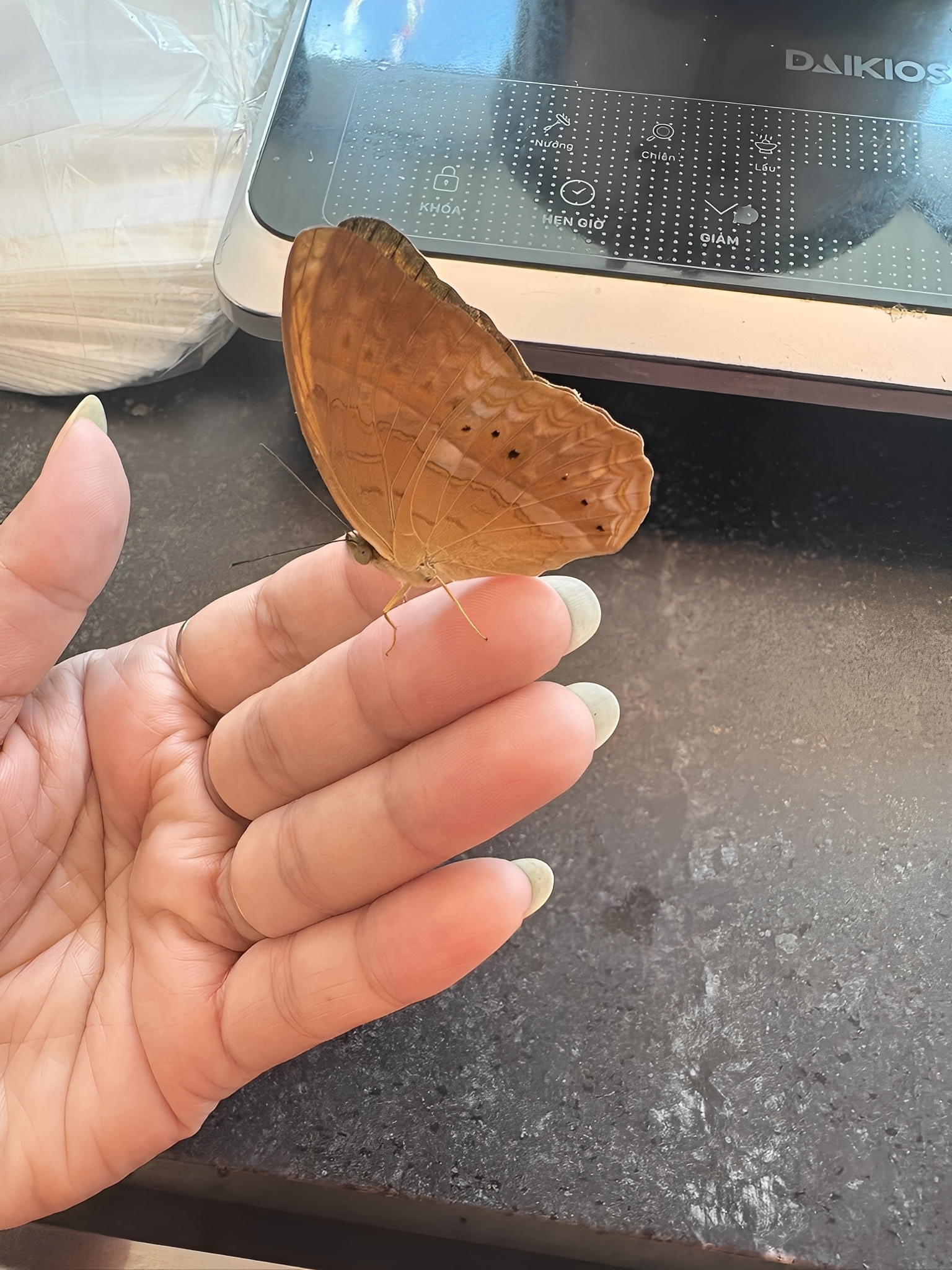 Trong video, con bướm nâu đậu ngoan ngoãn trên tay chị, chẳng hề sợ hãi.