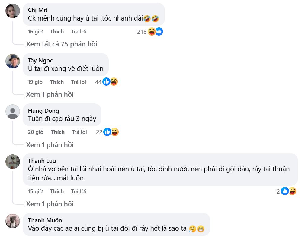 “Ù tai đâu không thấy, tôi thấy ù đầu vì mấy ông chồng ‘nhiệt tình với dịch vụ’ quá rồi đó! Lấy ráy tai mà mặc đồ như đi casting phim tình cảm thì ai chịu nổi .”