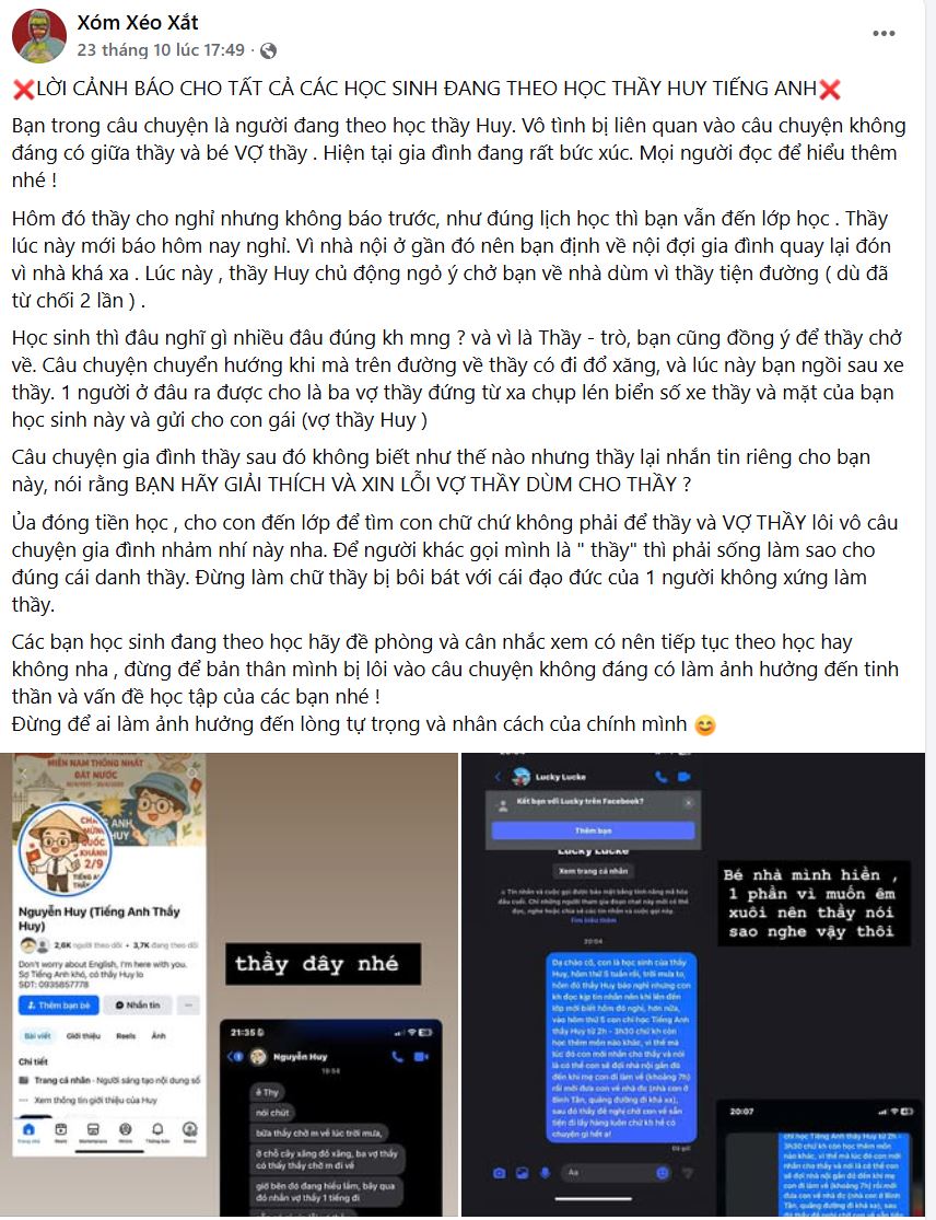 Tưởng mọi chuyện dừng ở đó, ai ngờ tối cùng ngày thầy Huy gửi tin nhắn riêng cho học sinh, nhờ “em” giải thích và xin lỗi vợ thầy giùm thầy (!).