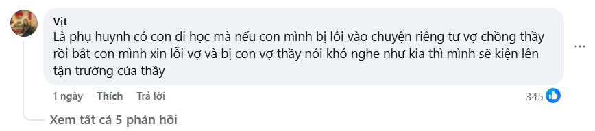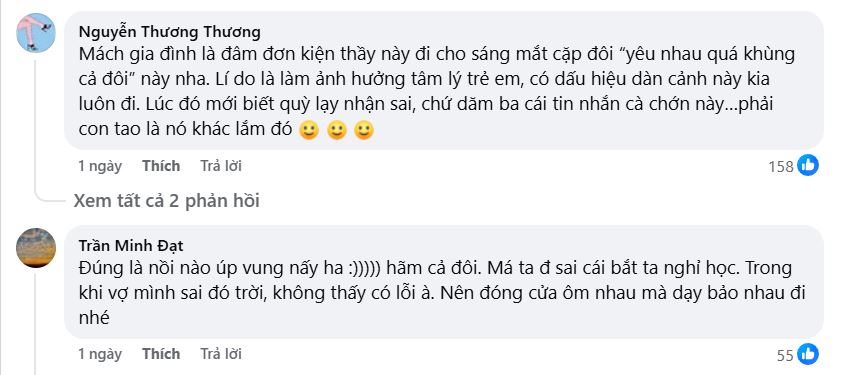 “Đúng là nồi nào úp vung nấy. Trong khi vợ sai đòi ly hôn, thầy lại không thấy lỗi của mình. Học sinh thì bị kéo vào, đúng là hãm cả đôi.”
