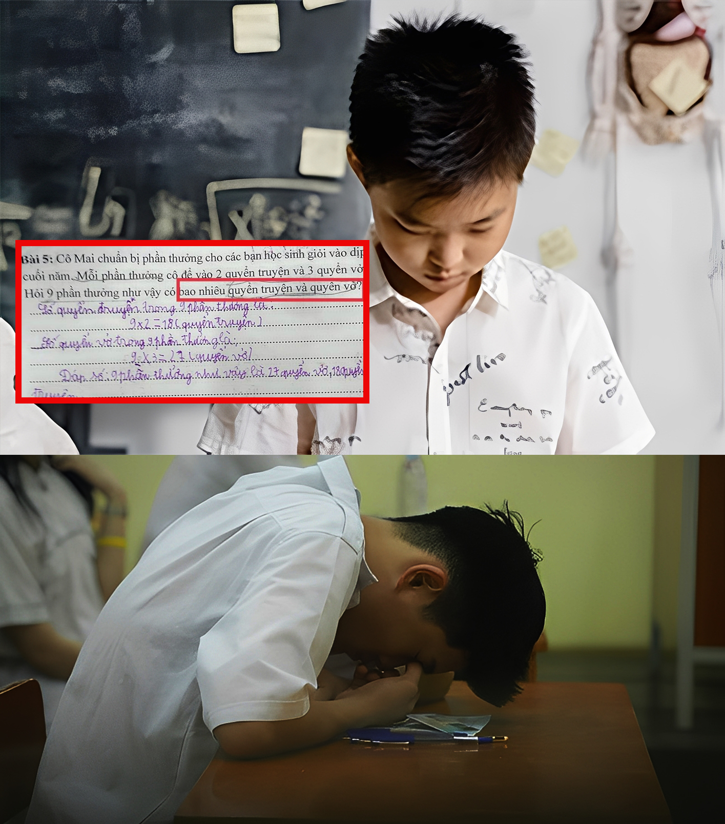 Đề bài như sau: "Cô Mai chuẩn bị phần thưởng cho các bạn học sinh giỏi vào dịp cuối năm. Mỗi phần thưởng cô để vào 2 quyển truyện và 3 quyển vở. Hỏi 9 phần thưởng như vậy có bao nhiêu quyển truyện và quyển vở?".