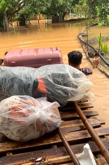 Chiếc bè được ông kết tạm bằng vài tấm gỗ, thùng xốp và dây nilon. Trên bè là vali, quần áo và hành lý của con gái được bọc kín bằng túi nilon. Ông bơi ngược dòng nước xiết, đẩy chiếc bè ra khỏi khu ngập, vượt qua hơn 200m nước sâu để gửi hành lý và người sang bên nhà họ hàng – nơi có đường khô hơn để tiếp tục hành trình.