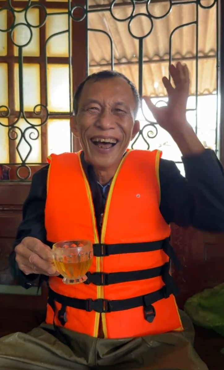 Bác nâng ly trà nóng, nụ cười hiền như nắng giữa mưa, khiến cả đội cứu hộ cũng thấy ấm lòng giữa cái lạnh của miền Trung.