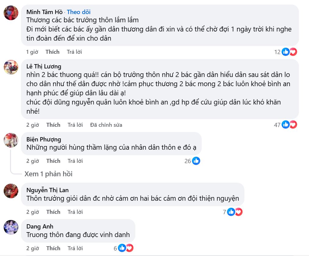 Ngay sau khi hình ảnh được đăng tải, hàng trăm bình luận đã để lại bên dưới bài viết, thể hiện sự cảm phục và yêu thương dành cho hai bác trưởng thôn: