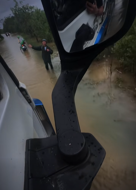 Trong lúc loay hoay giữa dòng nước lũ, may mắn thay, một bác tài xế xe tải chạy ngang đã dừng lại hỏi han. Thấy hai cha con ướt sũng, người cha chỉ cười gượng: “Đường ngập quá, sợ con trễ giờ nhập học nên tui cố đưa đi”. Không nói nhiều, bác tài mở cửa, ra hiệu cho hai cha con cùng lên xe: “Lên đây, để tôi chở đi cho kịp chuyến”.