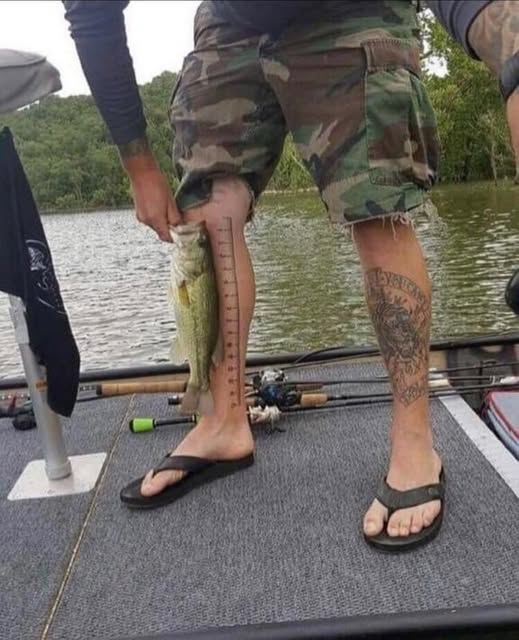 Theo chia sẻ của dân câu, “ông anh này” quá mê câu cá nên quyết định “xăm luôn cho tiện”, khỏi cần mang theo thước mỗi lần ra hồ. Cứ câu được con nào là áp vô đo ngay, chuẩn từng centimet!