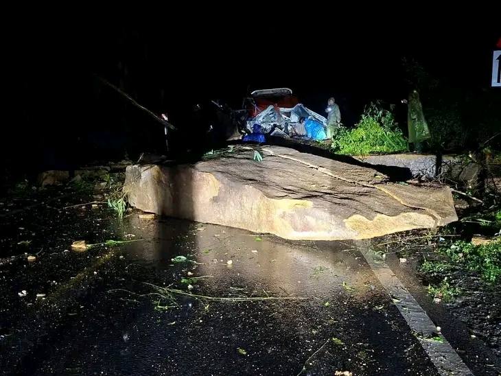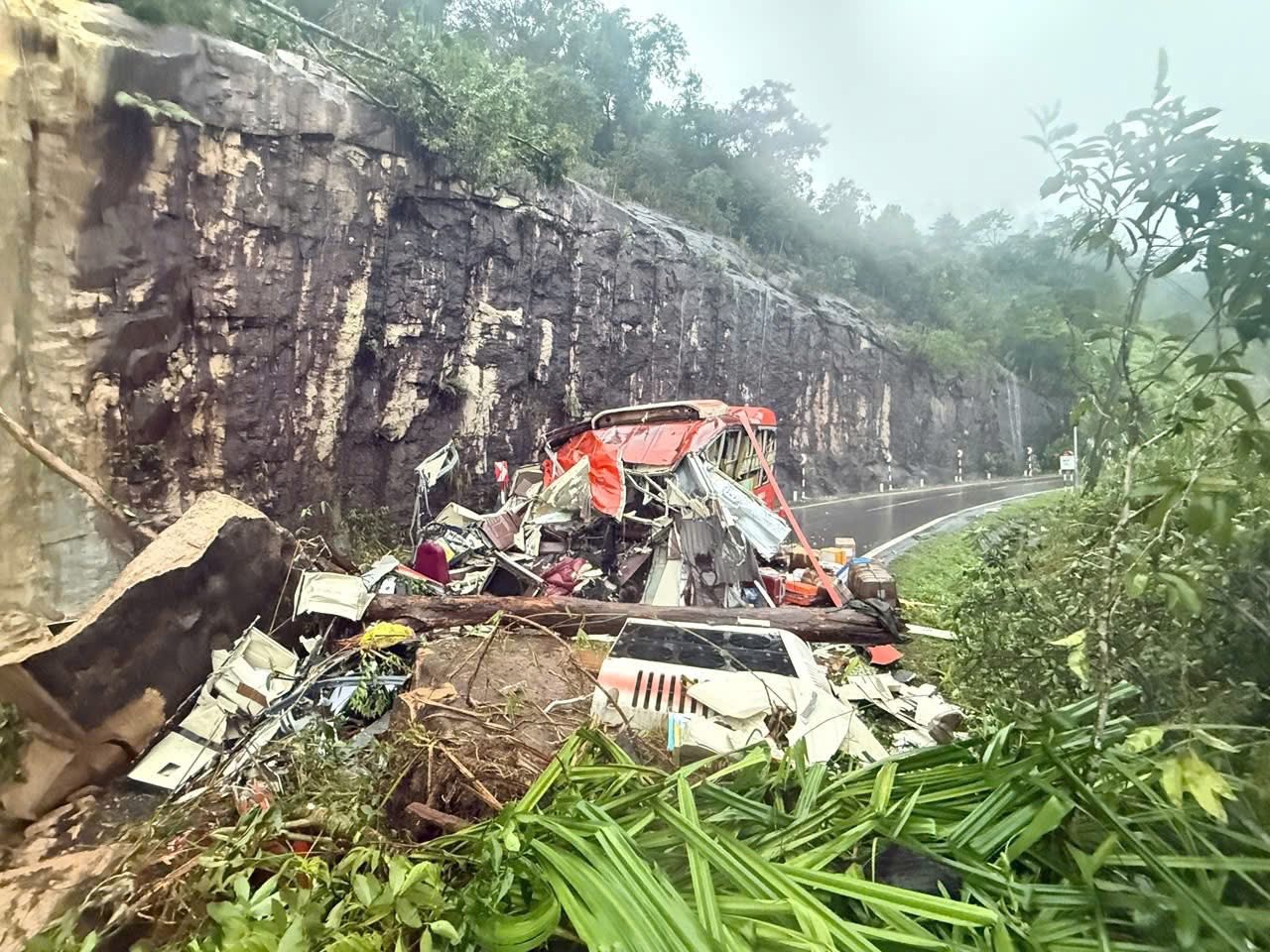 Khối đất đá sạt lở trên đèo Khánh Lê đã rơi trúng vào một xe khách chở 32 người, trong đó có 6 người tử vong; 13 người khác bị thương
