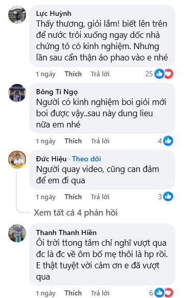 Lục Huỳnh: “Thấy thương, giỏi lắm! Biết bơi chéo dòng thế này là có kinh nghiệm đó, nhưng lần sau nhớ mang áo phao nhé em.”