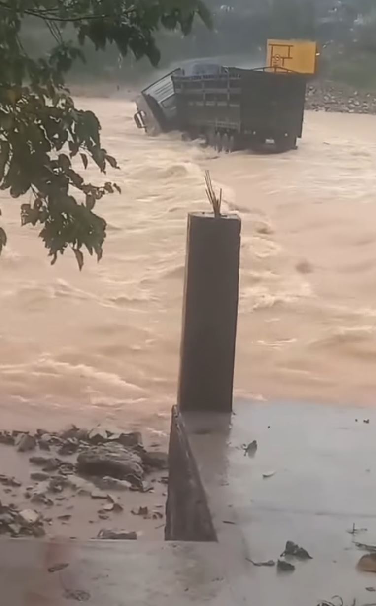 Nước lũ đục ngầu cuộn xiết, chiếc xe đầu kéo nặng hàng chục tấn chỉ nghiêng nhẹ vài giây… rồi biến mất hoàn toàn trước mắt người dân.